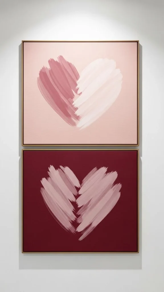A layered duo of canvases creates a modern moment. Each canvas carries part of the design, so together they form a complete heart. Try soft colors like blush and burgundy for harmony. If painting your own, use acrylics and palette knives for texture. Hang the two canvases with a small gap for visual breathing room. This idea works particularly well above a sofa or console because it gives height and structure.