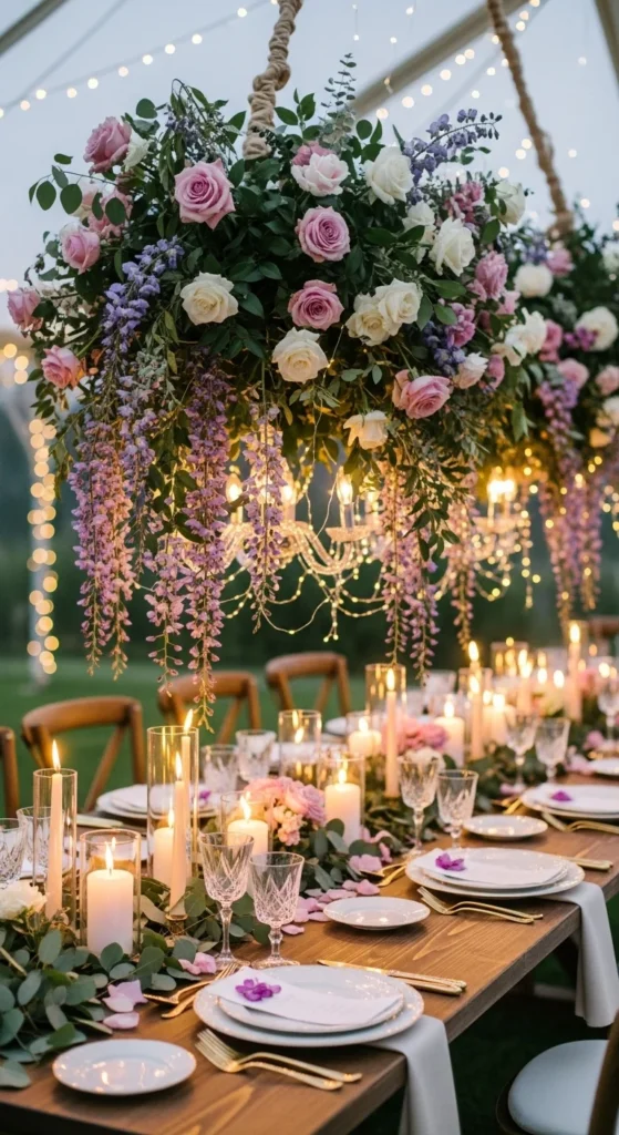 Hanging floral chandeliers make a breathtaking centerpiece. They draw eyes upward and fill the air with fragrance. Use lush blooms like roses or peonies for a romantic vibe, or mix eucalyptus and wildflowers for a boho feel. Hang them above dining tables or the dance floor to create visual drama. **Suspend them with clear wire or rustic rope** to match your theme.