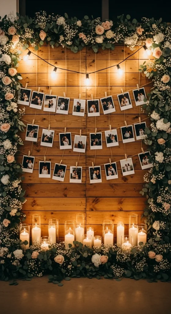 Turn memories into decor. Print your engagement photos or snapshots from your journey together. Hang them with twine and mini clips. Add fairy lights for a glowing effect. Guests love reminiscing as they walk through your story.