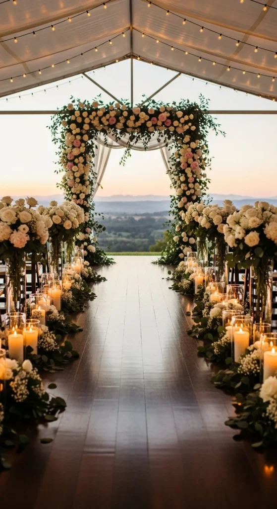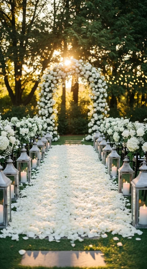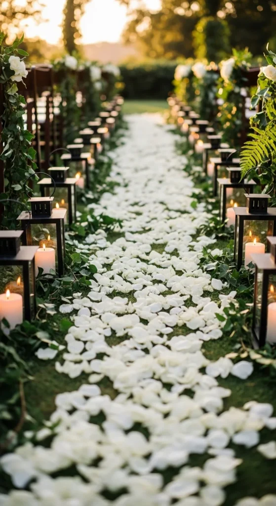 Lining the aisle with petals transforms even simple venues. Use real or faux petals in your color palette. Add lanterns or candles along the sides for romance. This small detail creates a stunning entrance for your walk down the aisle.