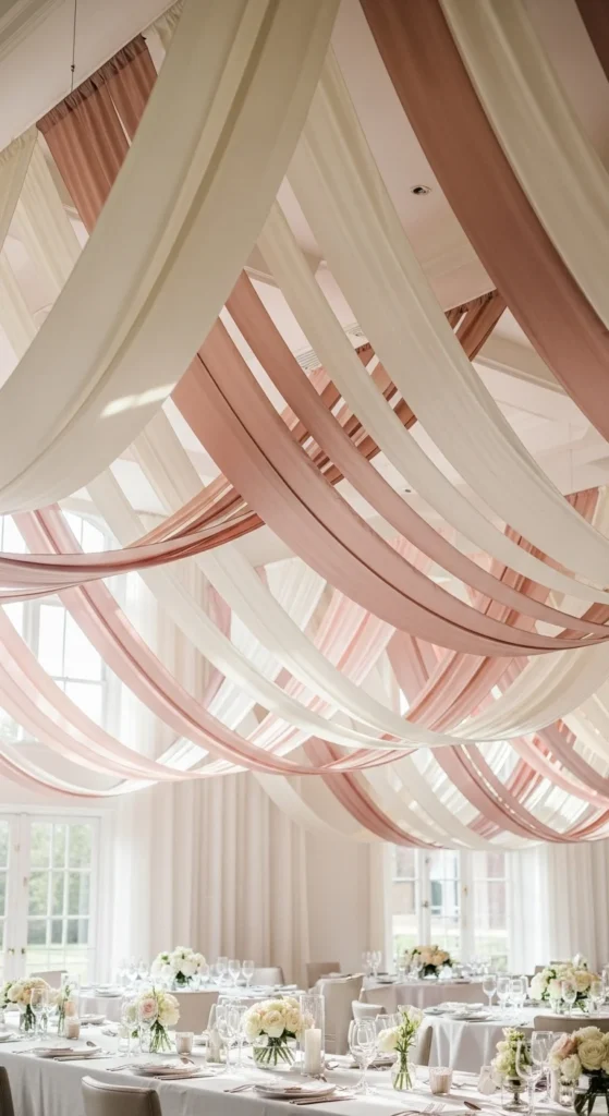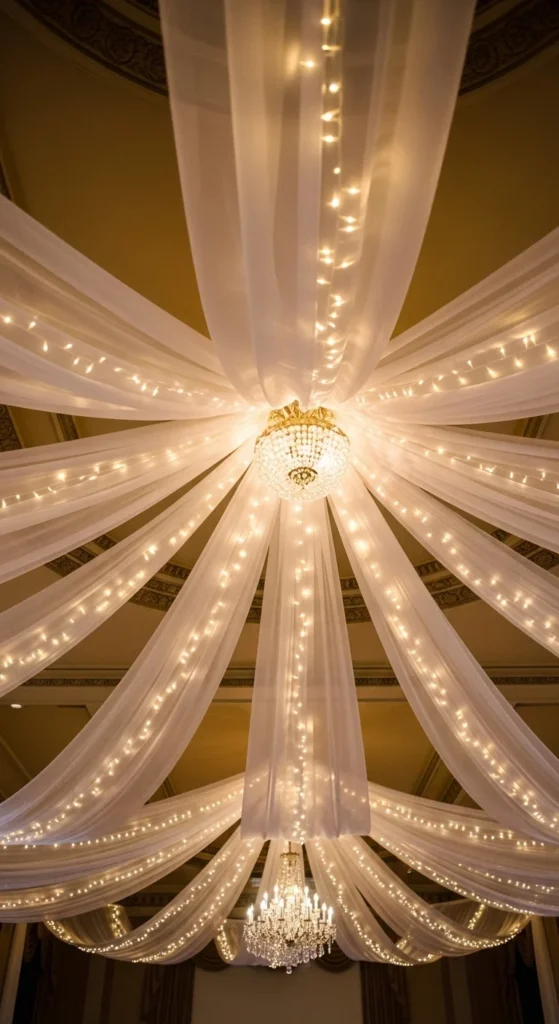 Ceiling drapery instantly softens the venue. Use chiffon or tulle for light, flowing movement. Combine with string lights or chandeliers for ambience. It works for barns, tents, or indoor venues and transforms any ceiling into something ethereal.