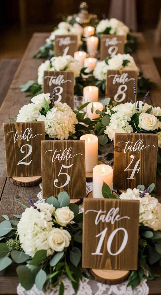 Wooden table numbers are functional yet stylish. You can burn, paint, or stencil numbers onto small plaques. They fit perfectly with rustic, boho, or garden weddings. Pair them with greenery or candles for an earthy, personalized detail.