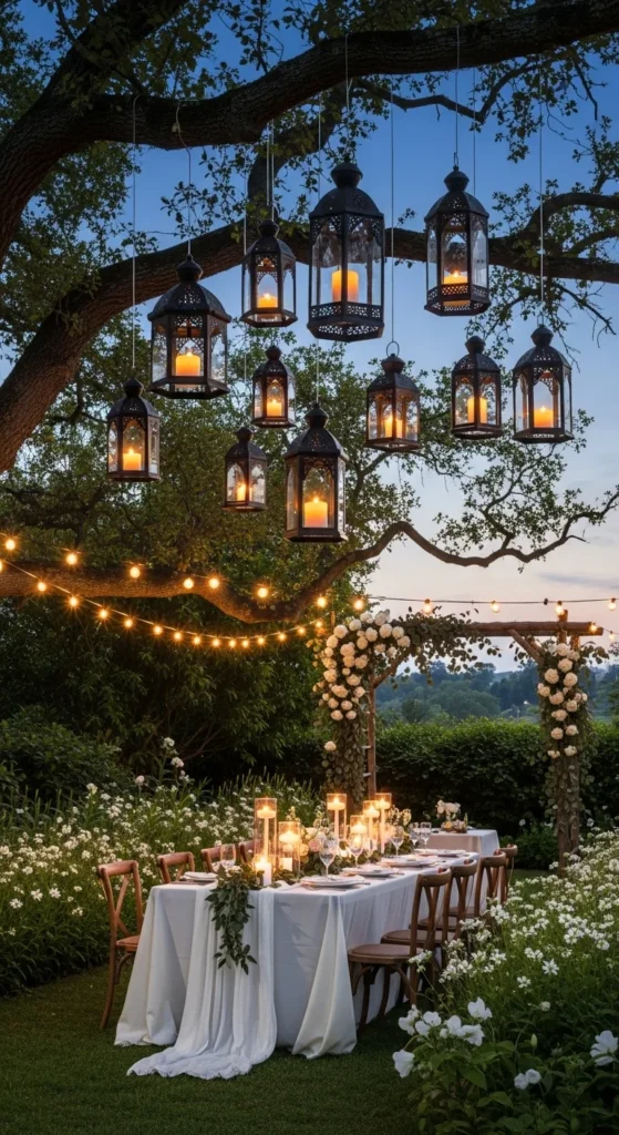 Lanterns create soft lighting and timeless charm. Hang them from trees, shepherd hooks, or pergolas. Mix metal finishes — black, bronze, or gold — for variety. They’re easy to reuse later for home or patio decor.