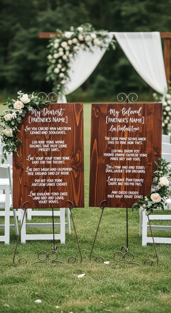Your vows become decor. Have them written or printed on wood, acrylic, or fabric banners. Place them near your ceremony area or reception entrance. It’s a meaningful, artistic touch that guests love to read.