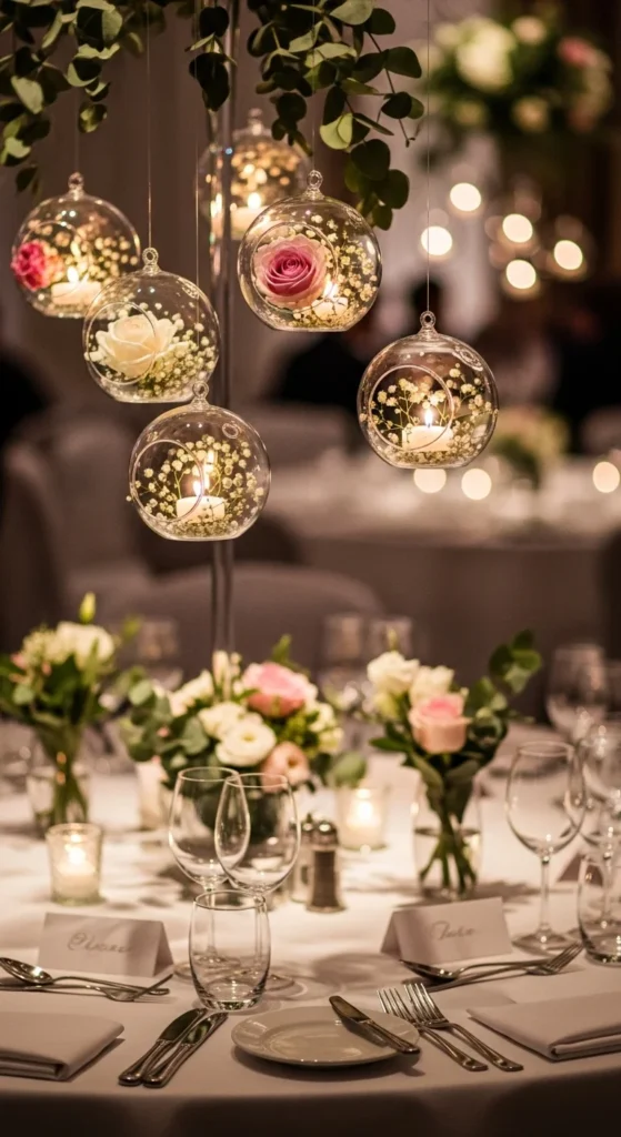 Glass orbs create magical floating light. Suspend them with fishing line or clear thread. Fill with candles, moss, or mini florals. The glow adds dimension and sparkle — a subtle detail that transforms the room.