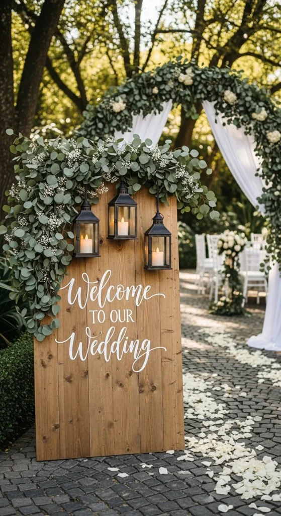 A custom welcome sign sets the tone for your day. Choose materials that fit your theme — wood for rustic, acrylic for modern, or mirror for glam. Add greenery or flowers that echo your bouquet. For a DIY approach, use a stencil and white paint for a handwritten look.