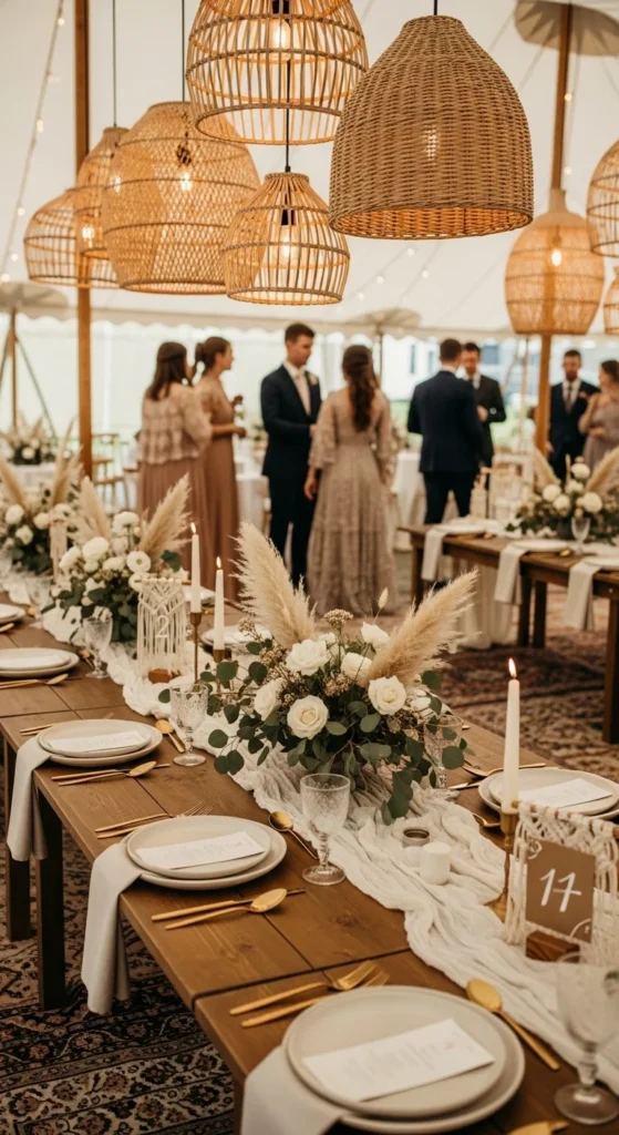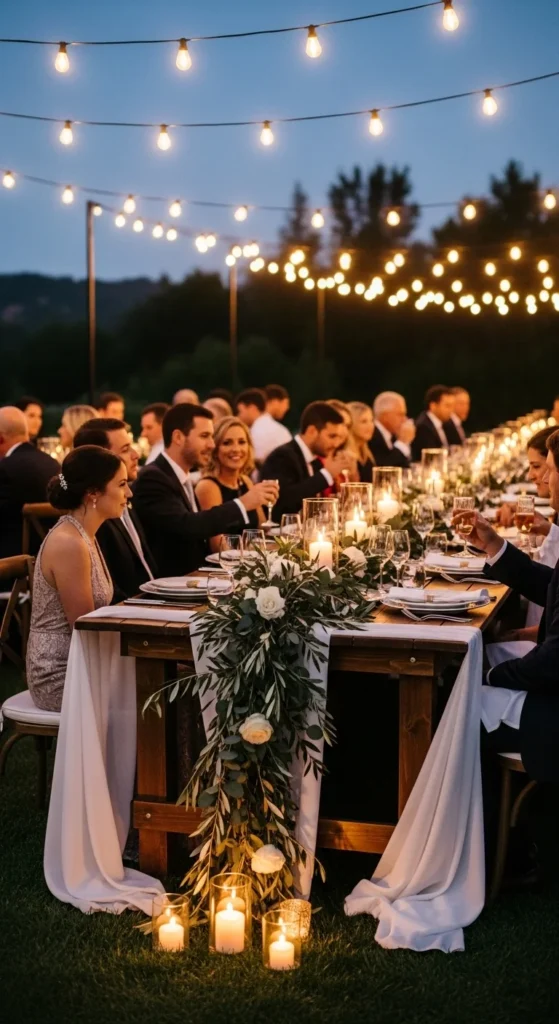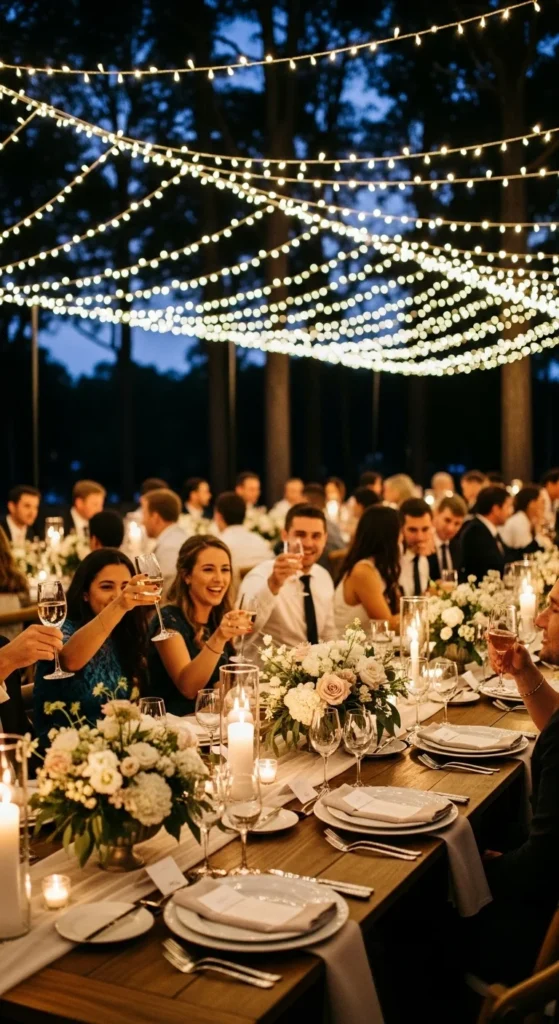 A canopy of string lights creates an ethereal glow. It works beautifully for both outdoor and barn weddings. Combine with candles or fairy lights in jars for added sparkle. The effect feels magical and intimate, perfect for evening celebrations that last late into the night.
