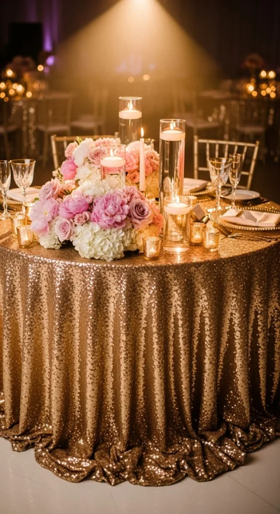 A sequin tablecloth adds instant glamour. Use it on key tables — like your sweetheart or cake display — for a touch of sparkle. Keep the rest of your decor neutral so the shimmer stands out. Sequins catch candlelight beautifully, creating a glowing focal point.