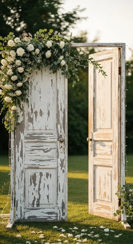 Old doors make stunning backdrops. Paint or distress them to match your palette. Frame them with flowers or draped fabric. They look great behind the ceremony spot or at the reception entrance. **A perfect DIY project** for couples who love repurposed charm.