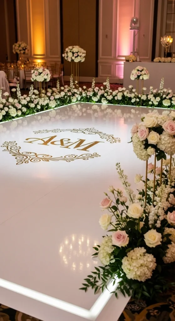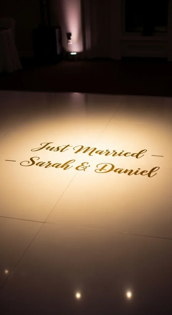 Add your own stamp to the dance floor. Custom decals with your names or date make it personal. Choose metallic or matte finishes depending on lighting. They’re removable and make stunning photos of your first dance.