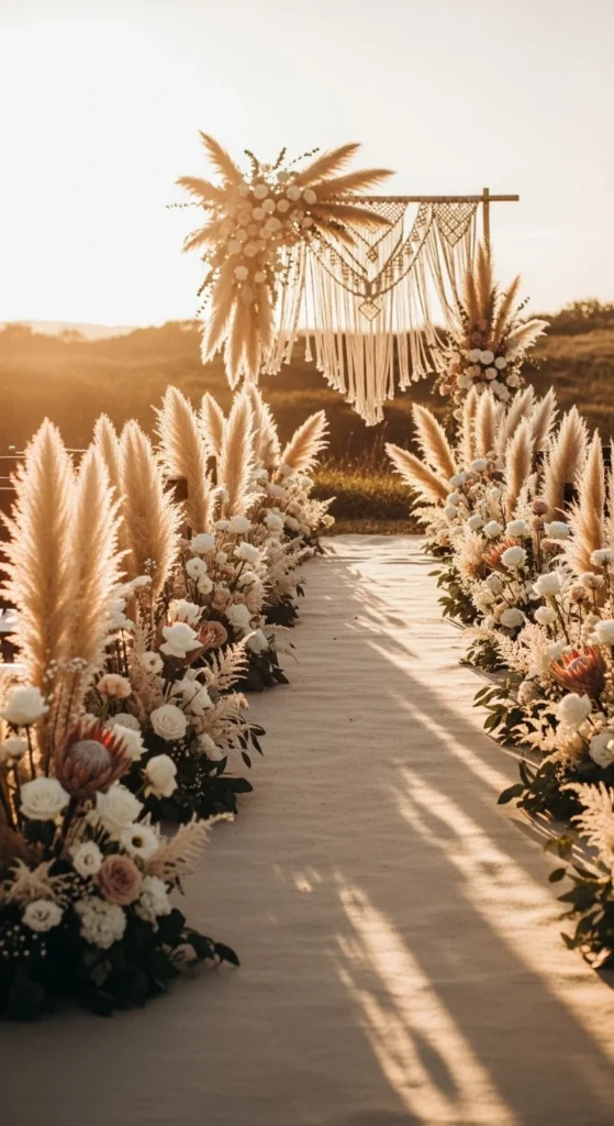 Pampas grass adds texture and height without heavy cost. Combine with neutral florals for an elegant boho vibe. Use it in floor vases or as part of an arch. It’s lightweight, easy to style, and reusable for home decor after the big day.