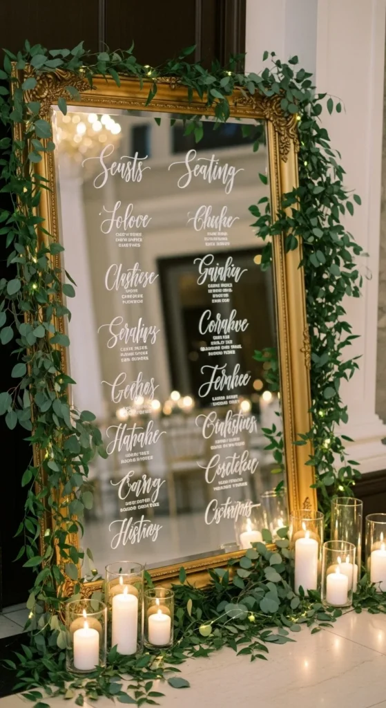 Mirror seating charts are both functional and glamorous. Rent or thrift a frame, then use a chalk pen or decal lettering for names. The reflection adds light and sophistication. A beautiful detail that guests will admire while finding their seats.