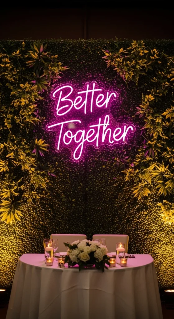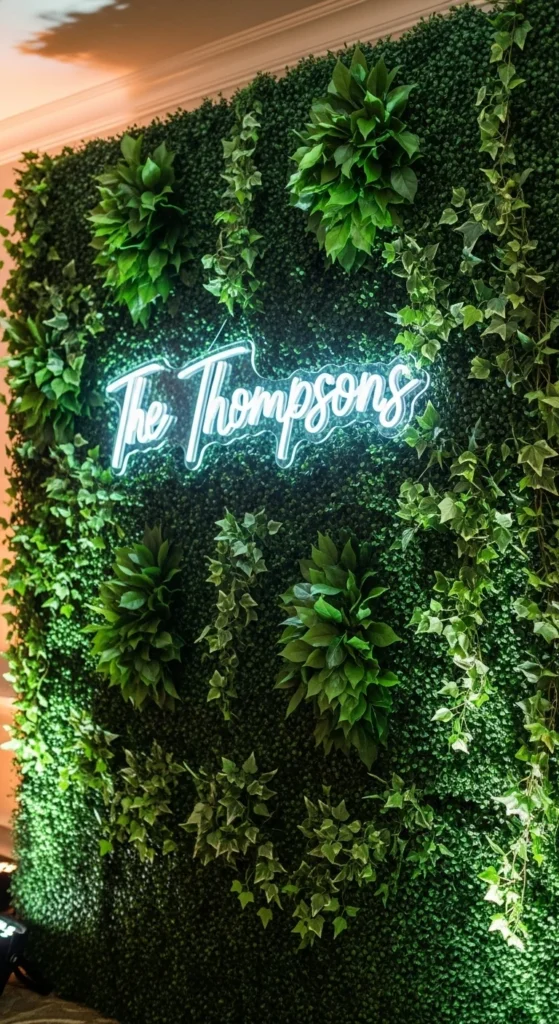 A greenery wall doubles as decor and photo backdrop. Use faux panels for affordability and reusability. Add signage or floral clusters for texture. Perfect behind the bar, dessert table, or sweetheart area for a polished, natural look.