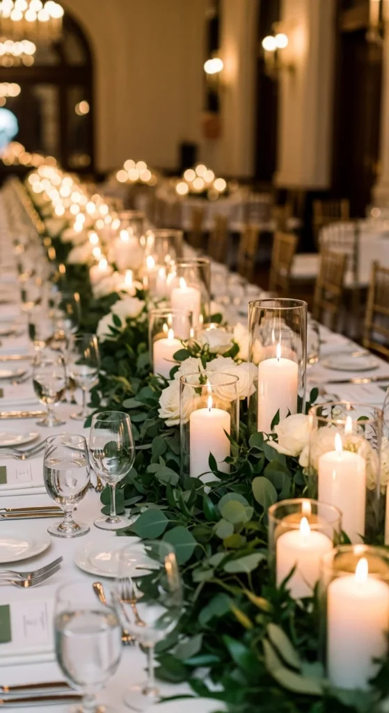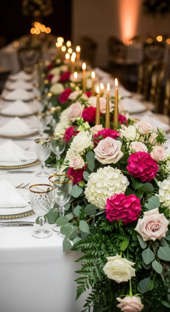 Replace traditional centerpieces with a full floral runner. It stretches the length of the table and looks rich and inviting. Mix greenery with blooms that match your bouquet. You can DIY it using faux florals for a cost-effective option that still wows.