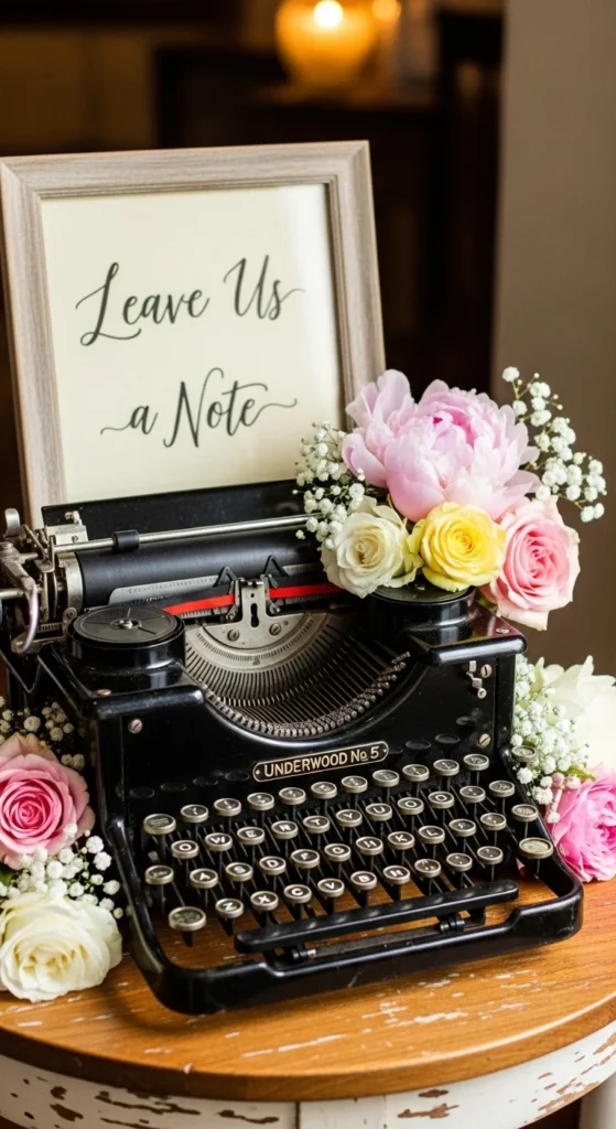 A typewriter guest book setup is charming and interactive. Guests can type their messages on paper for a keepsake full of character. Add vintage touches like old books or framed photos for a nostalgic display.