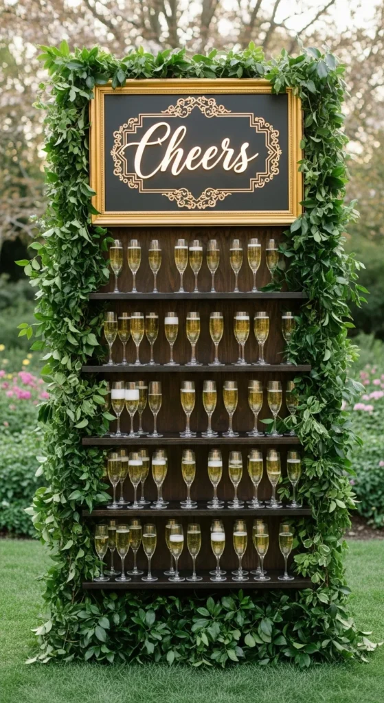 Champagne walls are both decor and delight. They welcome guests in style while serving as a photo spot. Rent a custom frame or build one with shelves. Decorate with florals or neon signage for flair.