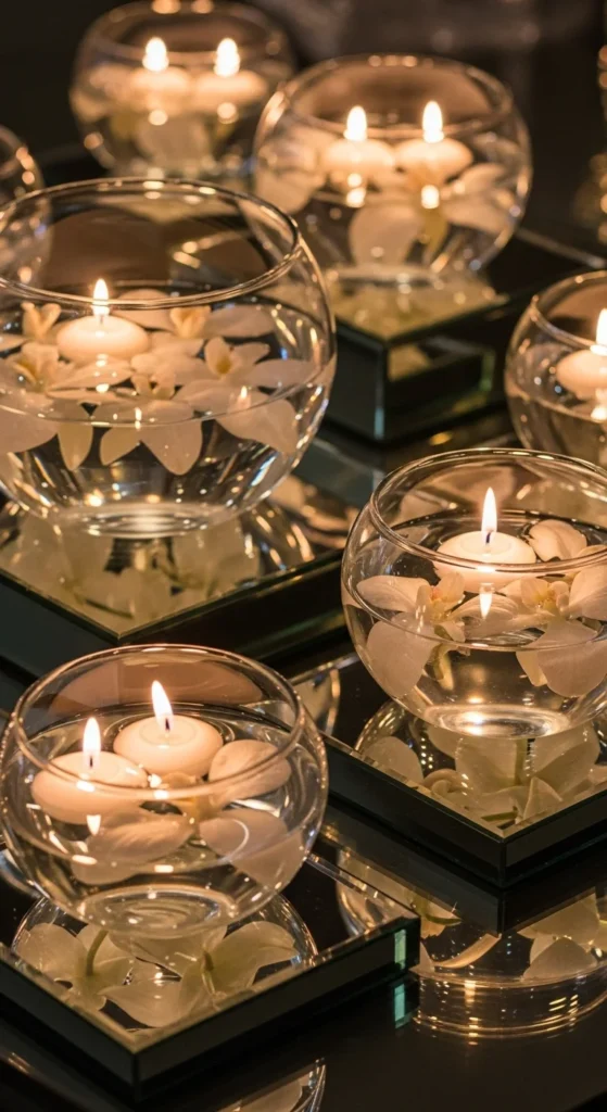 Floating florals feel ethereal and timeless. Use glass bowls, clear vases, or water-filled trays. Orchids, roses, or petals look stunning under floating candles. It’s simple to assemble and gives tables a gentle, romantic shimmer.