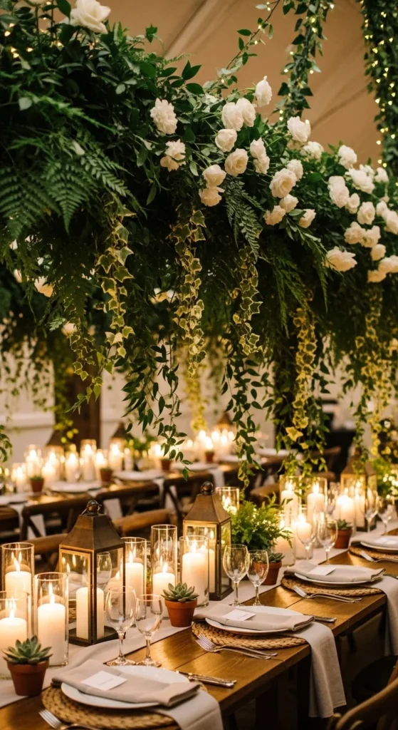 Greenery installations transform ceilings into gardens. Suspend arrangements using floral wire or grid panels. The natural canopy feels immersive and lush. Perfect for rustic barns, garden tents, or modern glass venues.