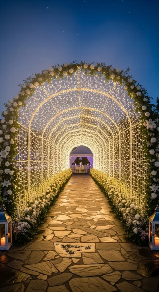A fairy light tunnel is pure magic. It sets the stage for an unforgettable entrance or exit. Use warm-toned bulbs for a soft glow. It’s ideal for evening receptions, creating cinematic moments guests will remember forever.