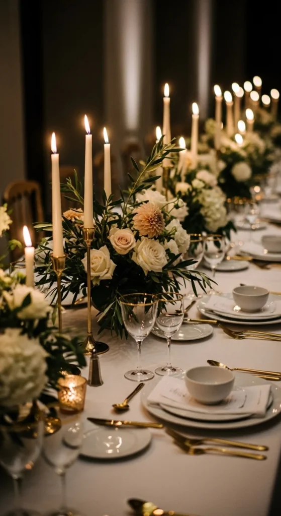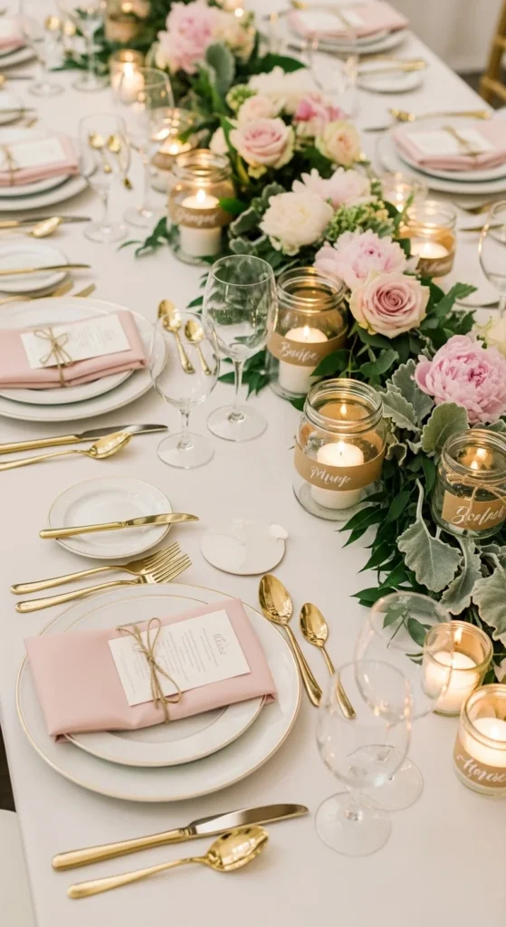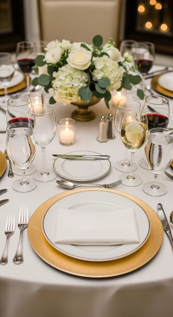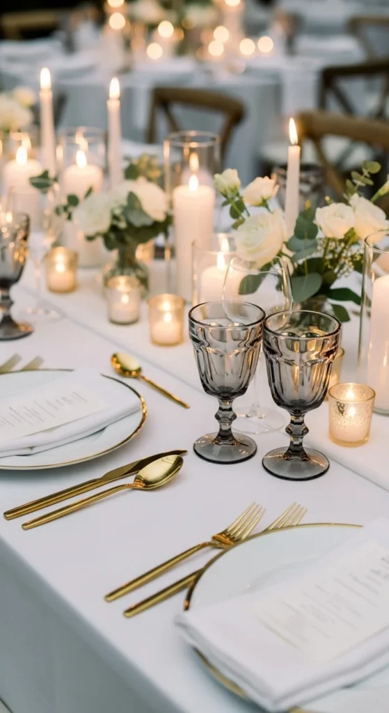 Metallic accents add understated luxury. Gold utensils and glassware gleam under candlelight, elevating simple settings. Rent sets for cost efficiency. Pair with neutral linens and soft florals for timeless elegance that feels both classic and modern.