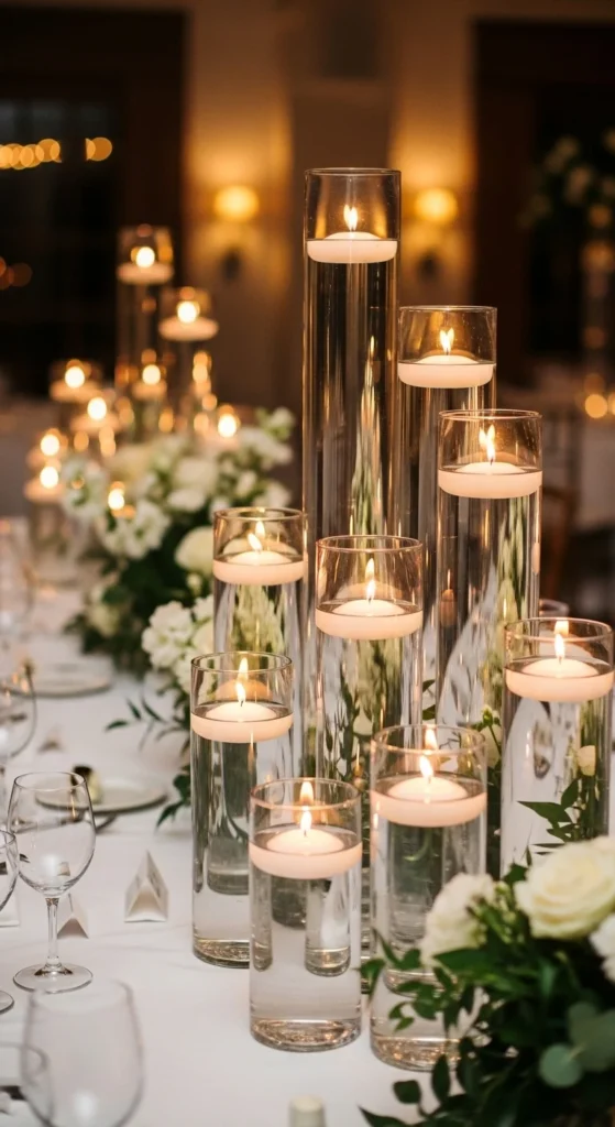 Floating candles offer soft light and height variation. Line them down tables or around the dance floor. Use clear glass for timeless elegance or tinted glass for color coordination. Affordable, romantic, and endlessly photogenic.