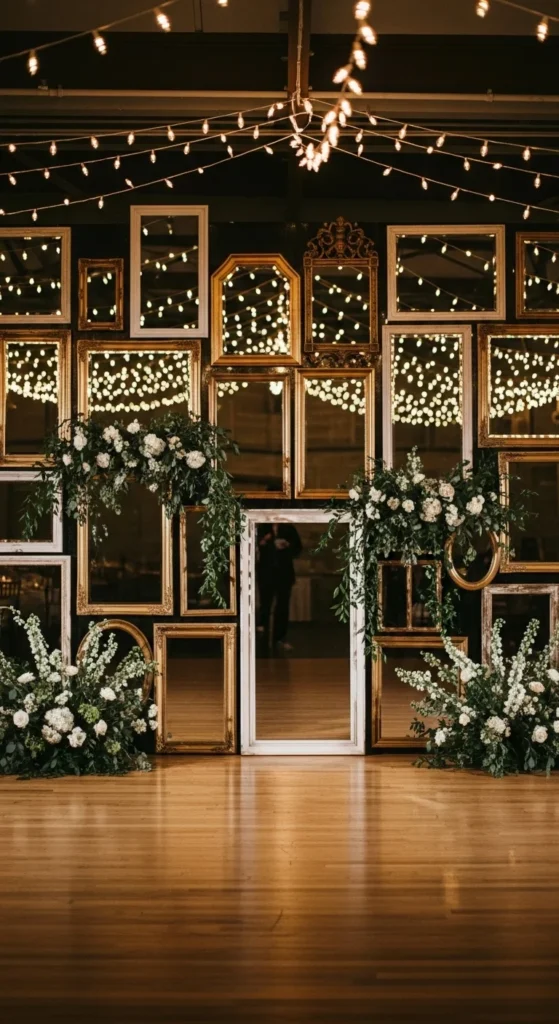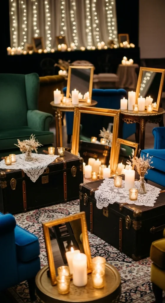 Antique mirrors add depth and shine. Arrange different shapes and sizes together for a vintage-glam backdrop. They reflect light beautifully, expanding smaller spaces and amplifying the glow from nearby candles or string lights.