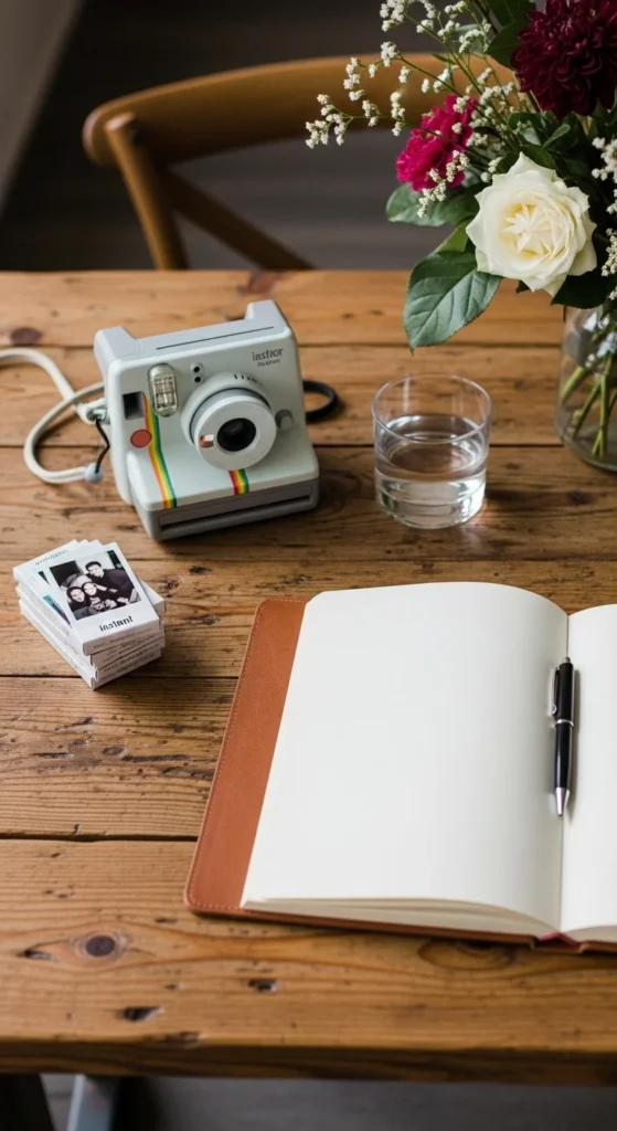Make your guest book interactive. Set up a Polaroid camera with film and markers so guests can take photos and leave notes. Provide washi tape to attach their pictures. The result is a scrapbook full of memories and personality — fun to flip through for years.