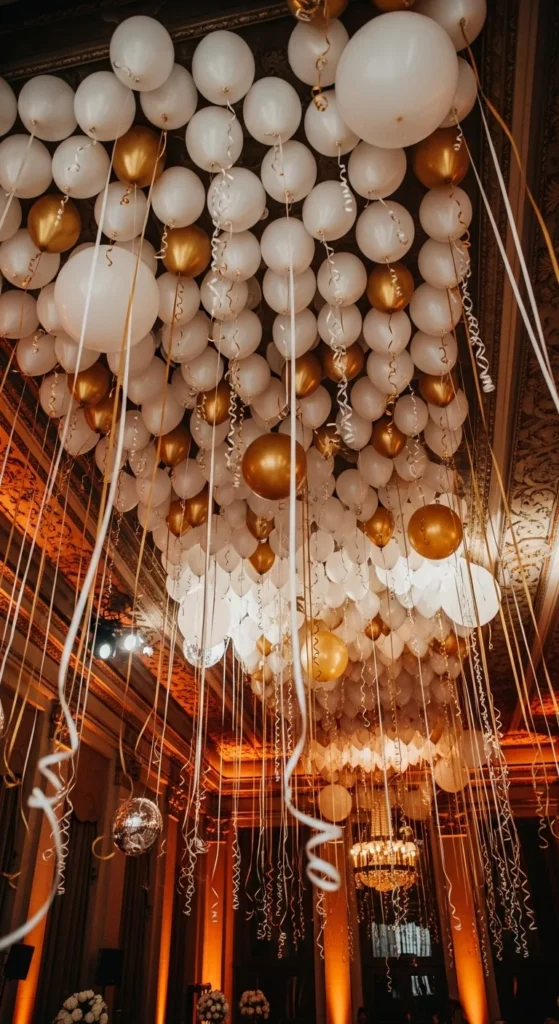 Balloon ceilings add playfulness and glamour. Stick to two or three colors to avoid clutter. Metallic tones like gold or champagne pair well with classic white. This works beautifully above dance floors or dessert tables for a whimsical, celebratory vibe.