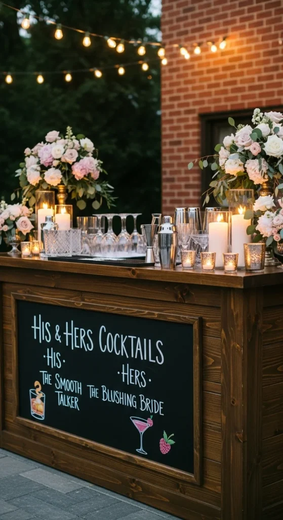 A personalized cocktail station adds character. Create drinks inspired by your story — maybe one sweet, one bold. Use handwritten or printed signage with your names. Decorate with florals and candles to tie it into the reception theme. Guests love interactive elements like this.