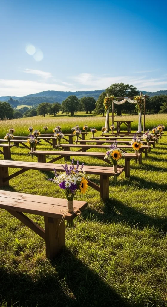 Wooden benches suit rustic and outdoor venues perfectly. They’re easy to decorate with greenery or small floral clusters. Add blankets or cushions for comfort. This setup feels communal and charming while keeping costs down.