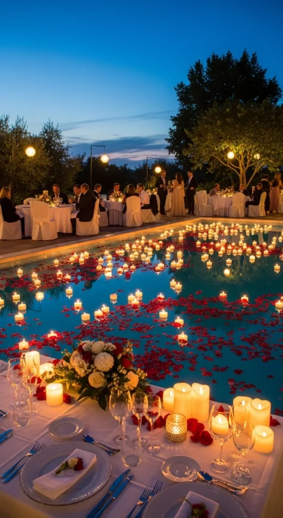 Pools become magical at night with floating candles. Add petals or small floral rings for color. Use LED candles for safety. The shimmering reflections create a romantic atmosphere — especially for sunset receptions.