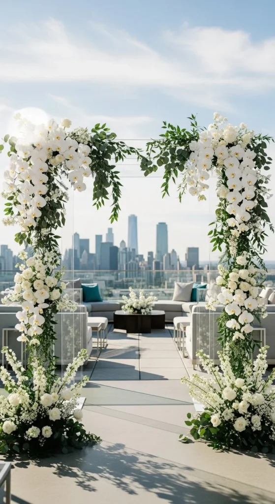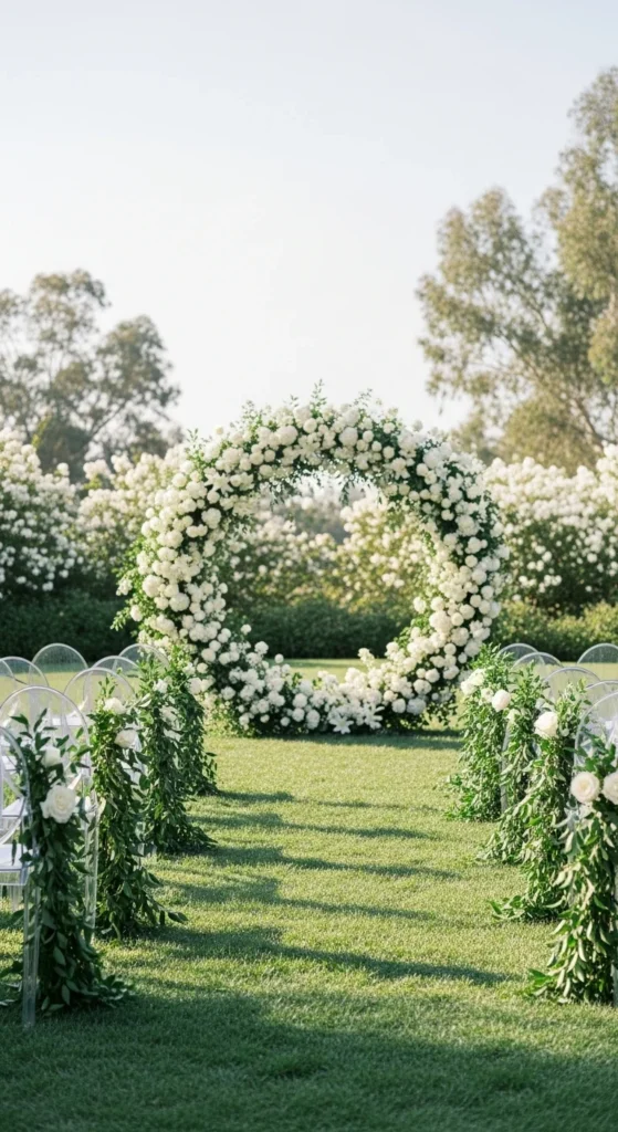 Acrylic arches are sleek and modern. They create the illusion of floating flowers and look stunning in minimal settings. Pair with white blooms and soft greenery. This style lets the view or landscape shine without distraction.