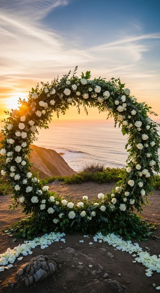 A wedding arch frames your vows beautifully. Go minimal with greenery and small white blooms, or bold with colorful flowers. Build it yourself using a metal or wooden frame wrapped in faux vines for budget-friendly elegance. **It’s the most photographed spot of the day.**