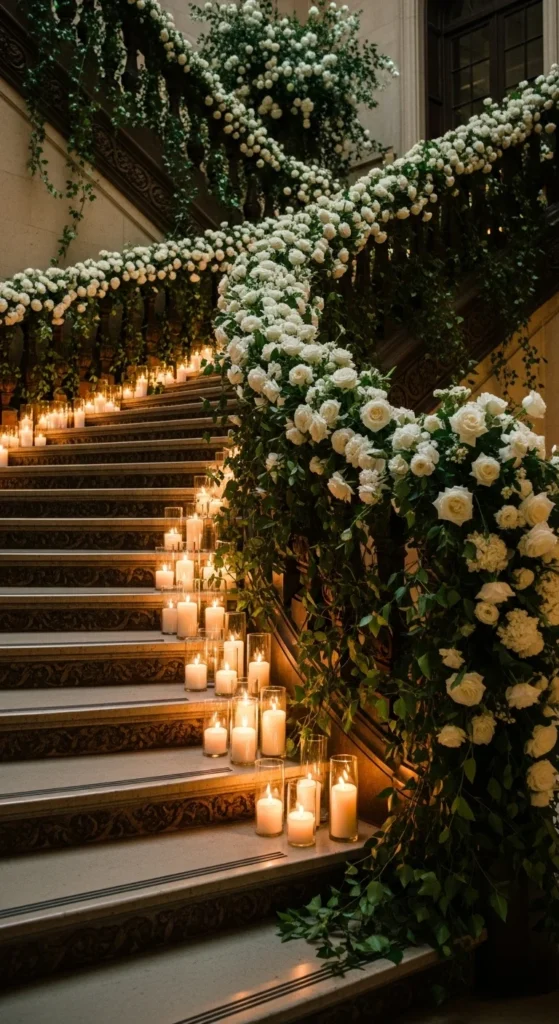 Transform staircases into showpieces. Drape them with florals and greenery, or weave in ribbon for color. Add candles at the base for a romantic glow. It’s an ideal photo backdrop and instantly adds drama to indoor venues.