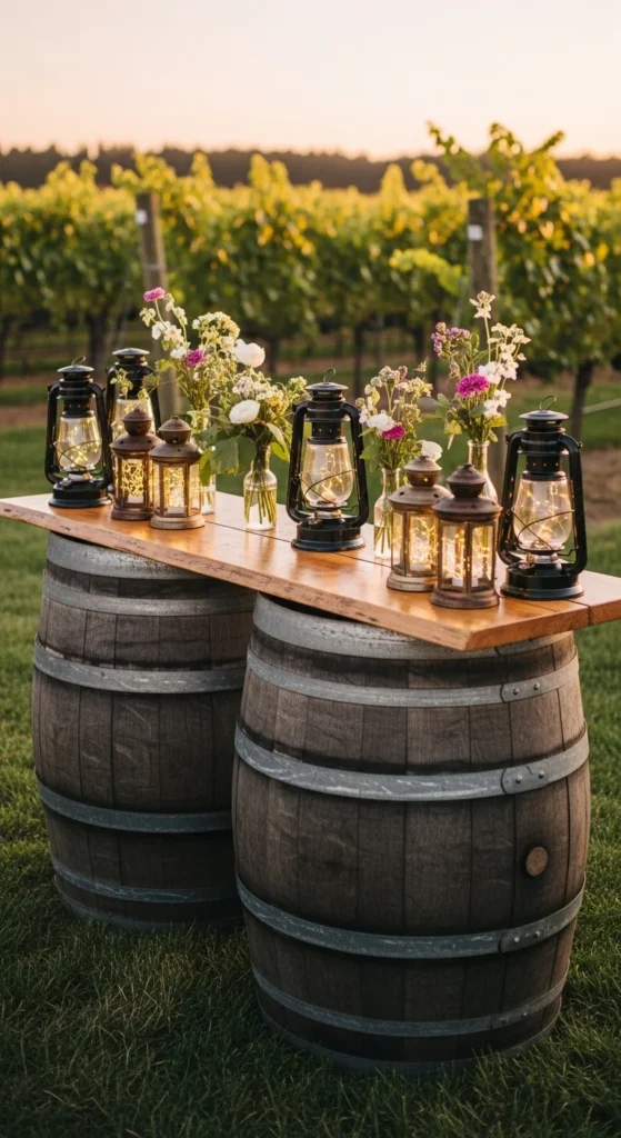 Wine barrels double as tables and decor. They suit vineyards or rustic venues perfectly. Use them for cocktail stations, dessert displays, or ceremony arrangements. Their natural texture adds warmth and authenticity to your layout.