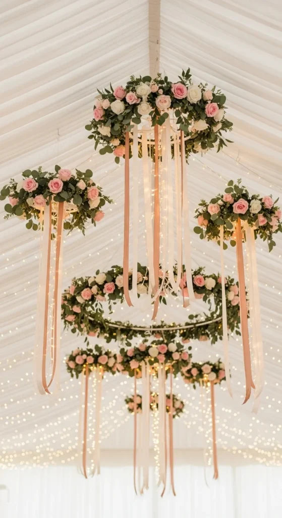 A floral canopy turns ceilings into gardens. Hang blooms densely for drama or sparsely for an airy look. Work with a florist or DIY using faux flowers on chicken wire. It’s immersive, romantic, and absolutely photo-worthy.