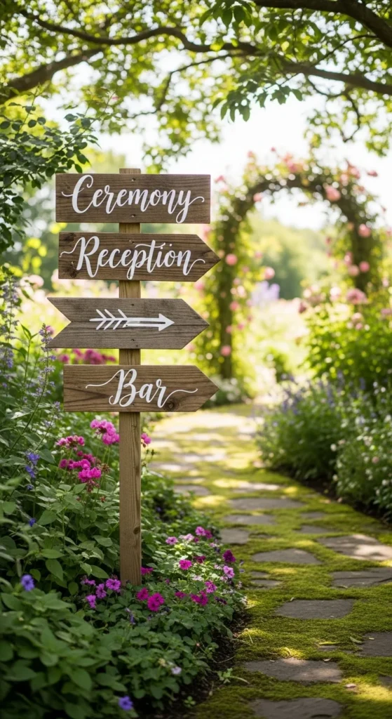 Wooden signs guide guests while adding character. Use reclaimed wood for authenticity. Paint with calligraphy fonts or stencil designs. Position them at key spots — entrances, walkways, or restrooms. Simple, useful, and photogenic.