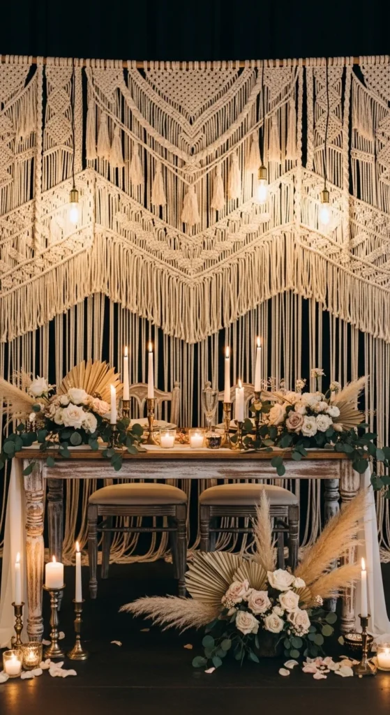 Macramé adds artisanal texture to bohemian weddings. Use as a ceremony backdrop, photo booth, or behind your table. You can DIY it or buy ready-made. Pair with pampas grass and earthy tones for a cohesive look.