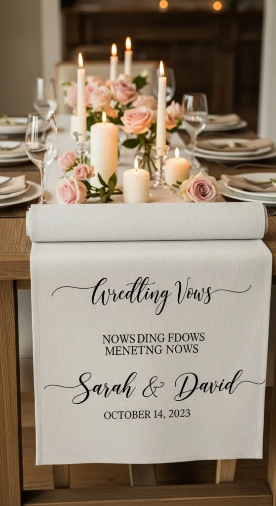 A vow-printed table runner feels meaningful and unique. Have your vows or favorite quote printed on fabric. It’s perfect for sweetheart tables. After the wedding, it becomes a sentimental keepsake you can frame or repurpose at home.