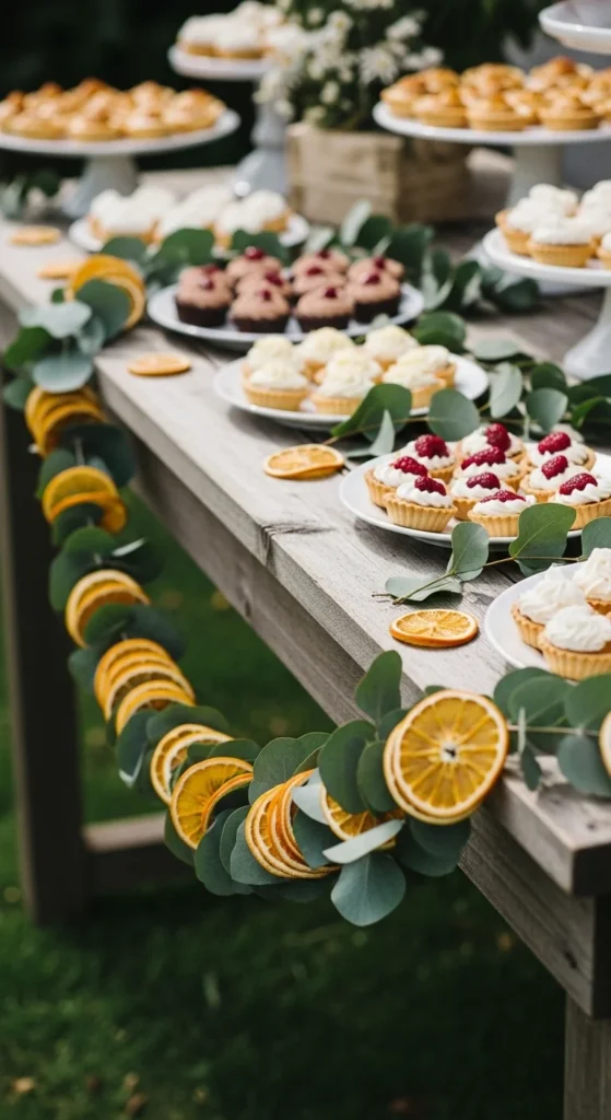 Dried citrus adds color and fragrance. Combine it with greenery for a cheerful, rustic look. Perfect for summer weddings or outdoor brunch receptions. It’s a fun DIY project that looks artistic and smells amazing.