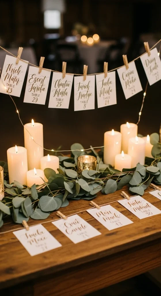 Escort cards help guests find their seats with style. Use textured paper and metallic ink for sophistication. Hang them on twine with mini clothespins for a personal touch. It’s a small detail that feels intimate and handmade.