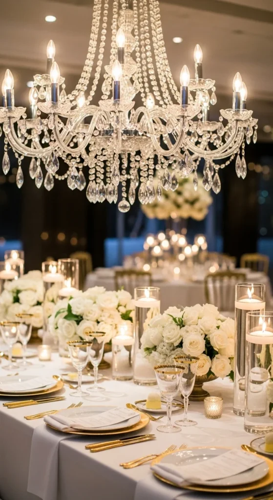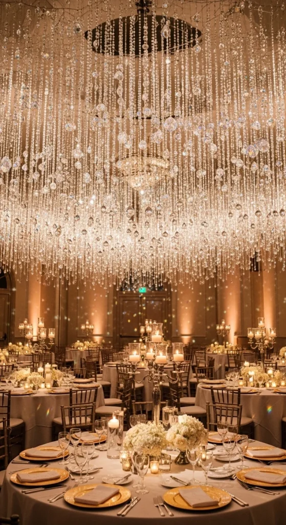 Crystals catch light like magic. Hang strands over tables or the altar for shimmer. Combine with soft lighting to make them twinkle. It’s glamorous yet elegant — perfect for evening or ballroom weddings.