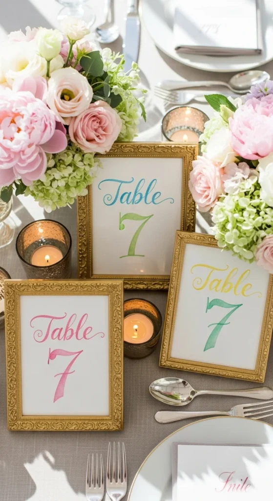 Watercolor numbers bring an artistic touch. Soft gradients in blush, sage, or lavender add personality to each table. Print or paint them yourself for a DIY option. They look especially charming in gold or acrylic frames — a subtle pop of color without overwhelming the design.