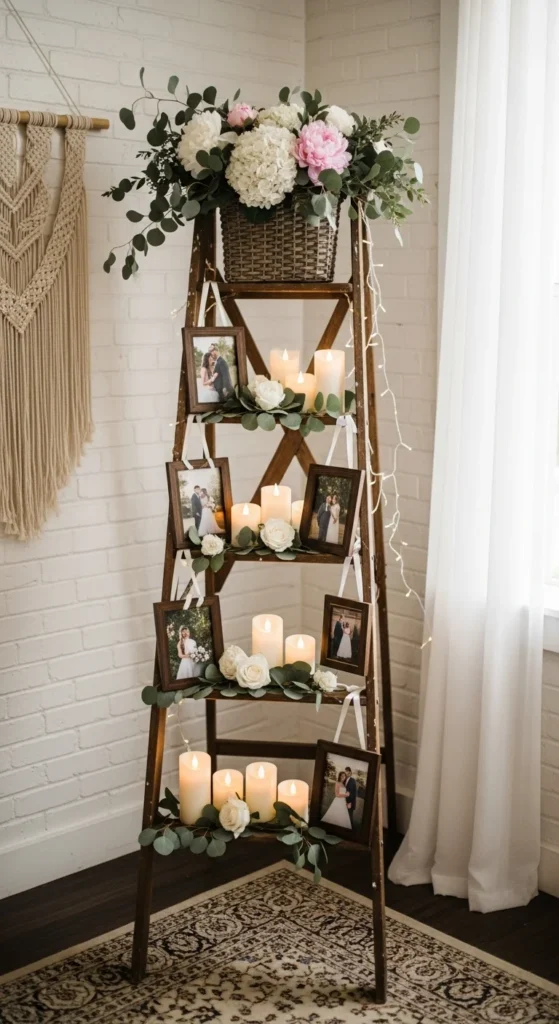 Old ladders make creative displays. Use shelves for candles, photos, or floral decor. Perfect for rustic and barn weddings. Wrap string lights or greenery around the frame for warmth. It’s practical, decorative, and a conversation starter for guests.