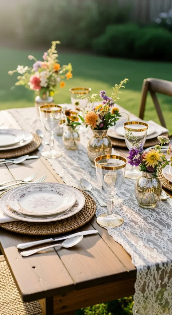Lace overlays add softness and texture. Layer them over wood or linen for contrast. They evoke timeless romance and pair beautifully with candles or vintage tableware. Affordable and easy to reuse for showers or anniversaries later.