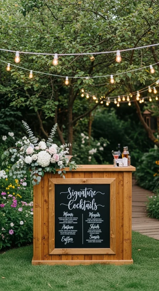 Custom bar signs make your drink station stylish and organized. Use chalkboard, mirror, or acrylic boards depending on your theme. Include your drink names, ingredients, and a fun quote. It’s both decorative and functional for guests to enjoy.