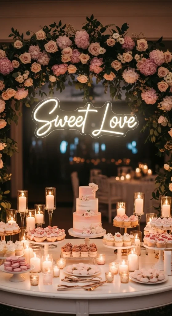 Your cake deserves its own spotlight. Style the table with fabric drapes, candles, and flowers. Add a personalized cake topper for flair. Keep the area well-lit for photos — this becomes one of the most memorable backdrops of the night.