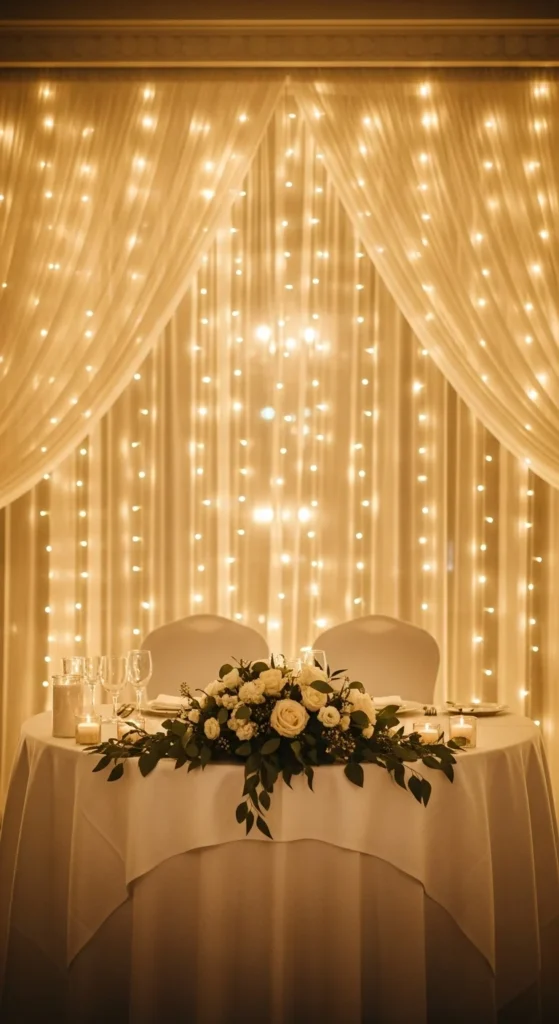 Fairy light curtains create instant romance. Hang them behind your main table, bar, or photo booth. Combine with tulle or chiffon for a soft, diffused glow. It’s simple to install and transforms any blank wall into pure enchantment.