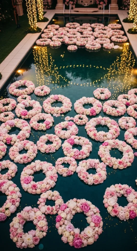 Floating florals turn pools into art. Use foam wreaths to hold flowers and let them drift across the water. Add waterproof LED lights for a dreamy glow. The reflections create a romantic ambience that’s unforgettable after sunset.