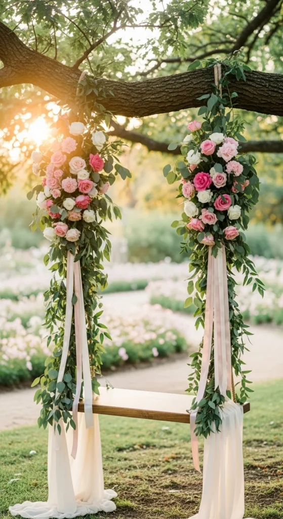 A floral swing adds whimsy and makes for stunning photos. Decorate with flowers matching your bouquet or seasonal greenery. Hang it securely from a sturdy branch or pergola. It’s not just decor — it’s a dreamy photo spot for couples and guests alike.